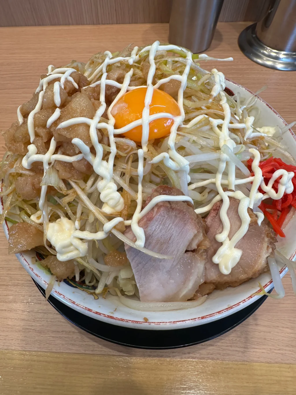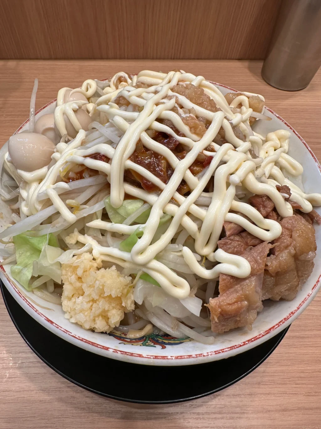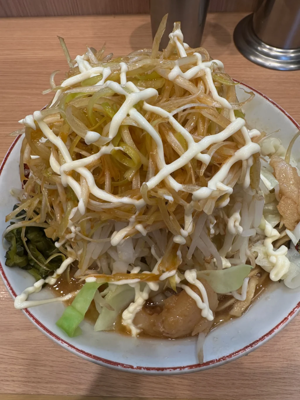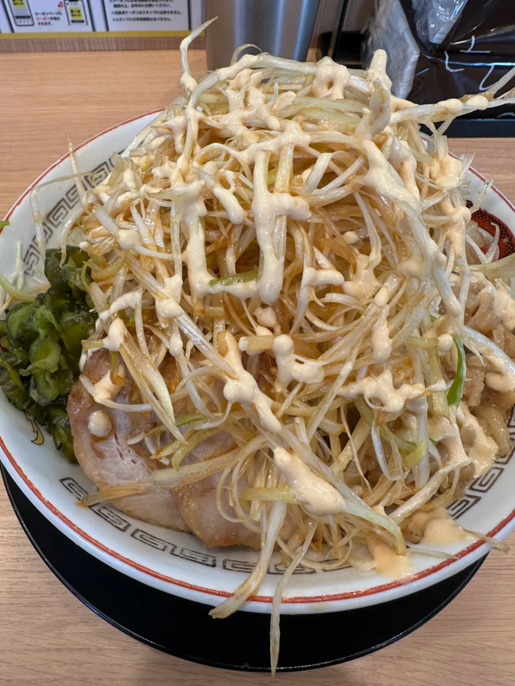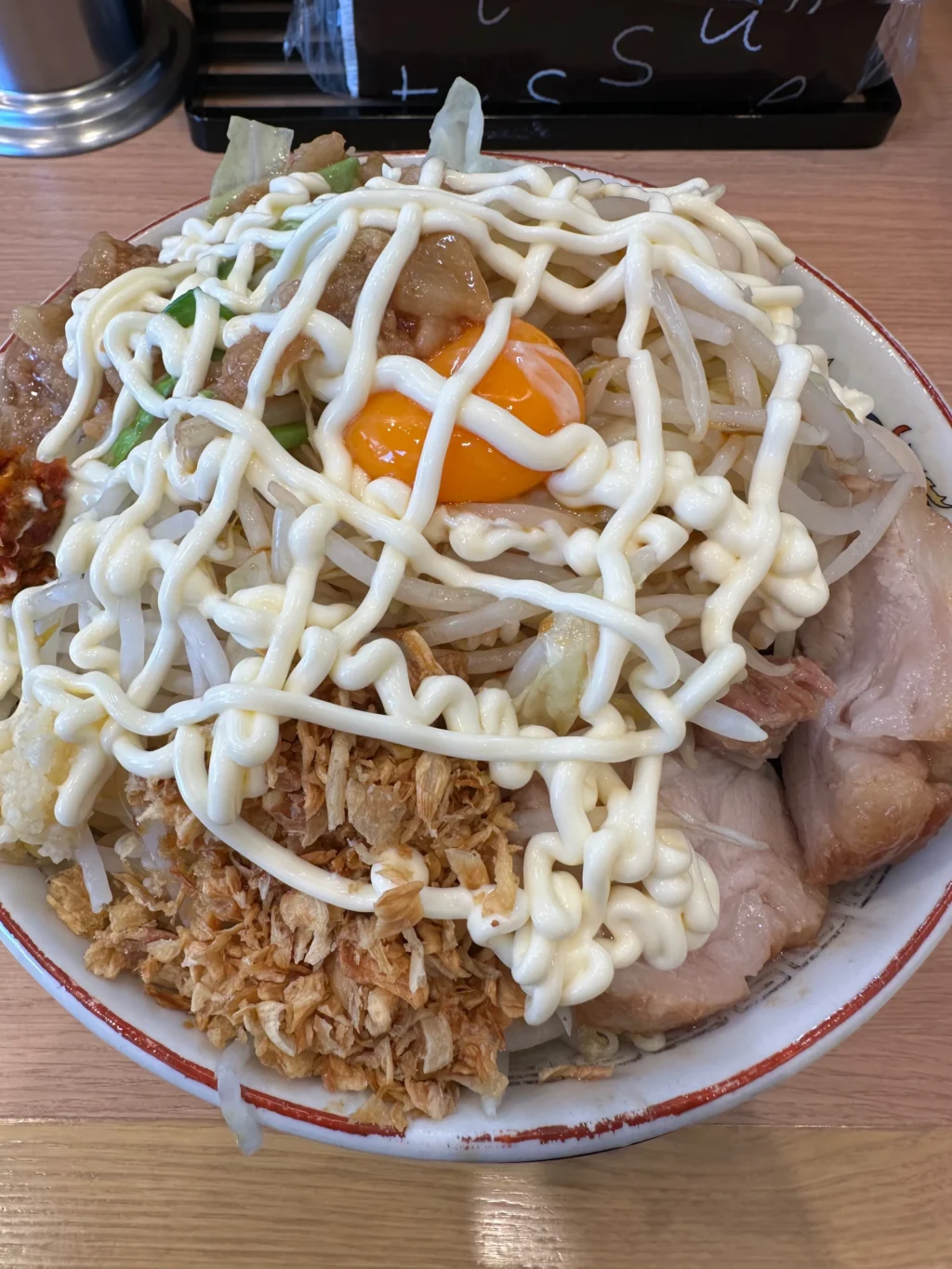 夏にだけ提供されるのが『冷やし中華』だ。ベースはたっぷりマヨネーズだれ、ゆでキャベツの代わりに千切りキャベツが載っていて、フライドオニオンのトッピング、仕上げにガリマヨ(ガーリックマヨネーズ)がかかっている。これがうめすぎるー!!夏場は、週3で通い、冷やし中華ばかり食べていた。『冷やし中華、ニンニク少し、他マシマシ』がわたくしの、鉄板メニューとなった。