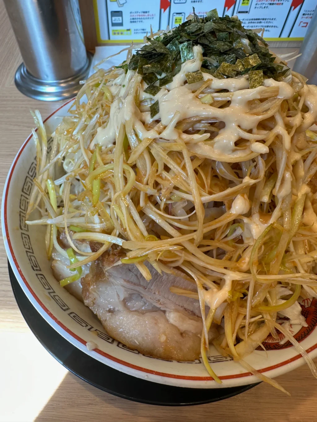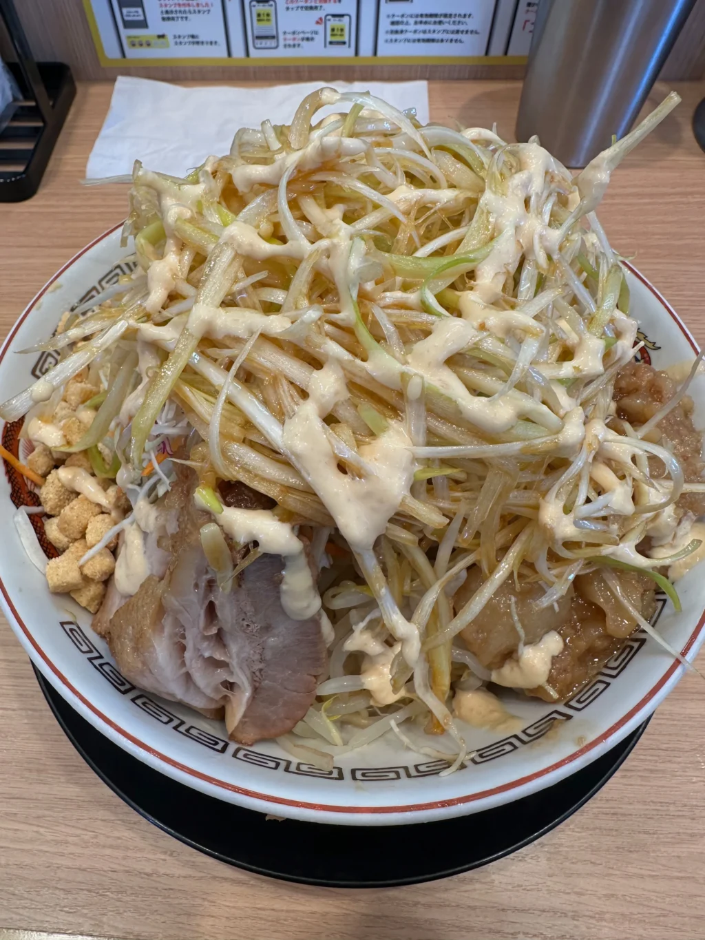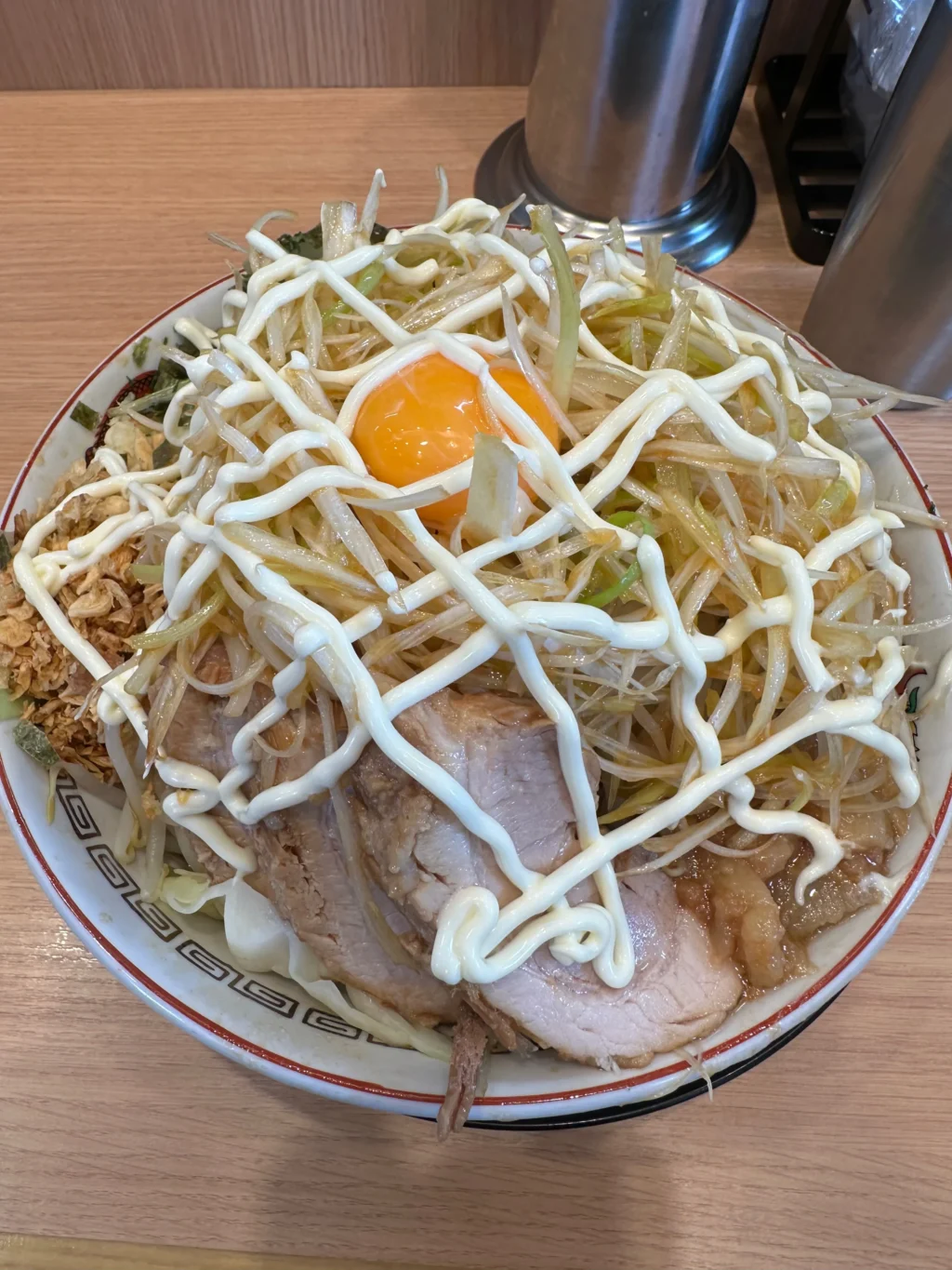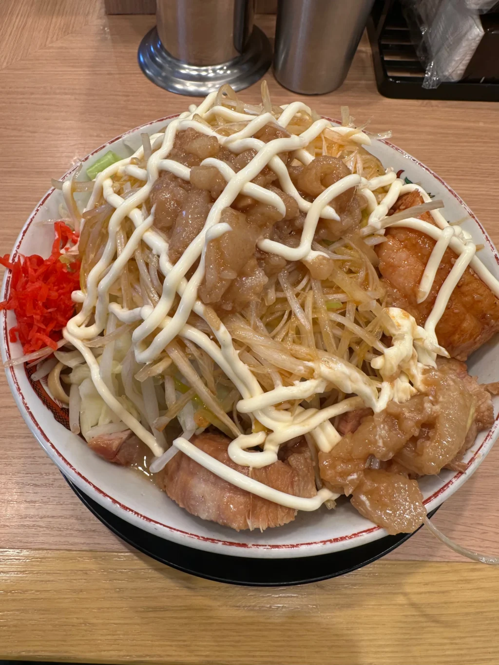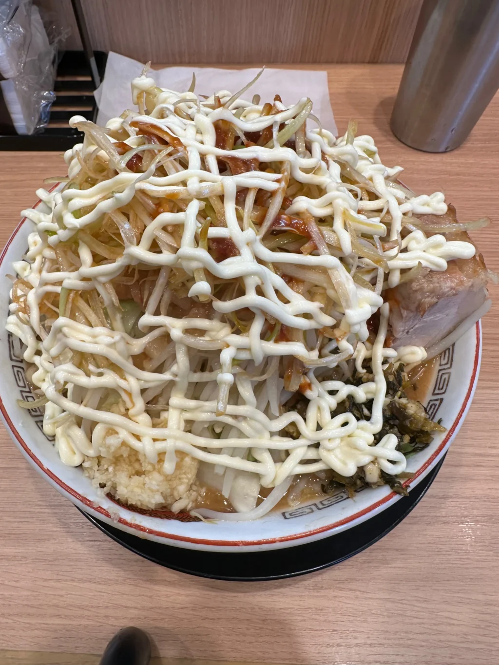 夏にだけ提供されるのが『冷やし中華』だ。ベースはたっぷりマヨネーズだれ、ゆでキャベツの代わりに千切りキャベツが載っていて、フライドオニオンのトッピング、仕上げにガリマヨ(ガーリックマヨネーズ)がかかっている。これがうめすぎるー!!夏場は、週3で通い、冷やし中華ばかり食べていた。『冷やし中華、ニンニク少し、他マシマシ』がわたくしの、鉄板メニューとなった。