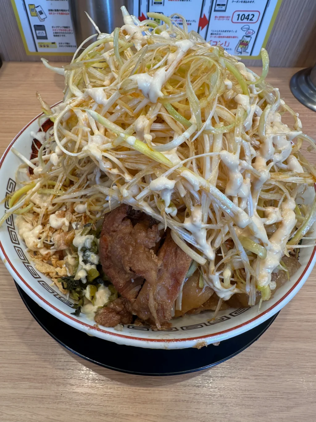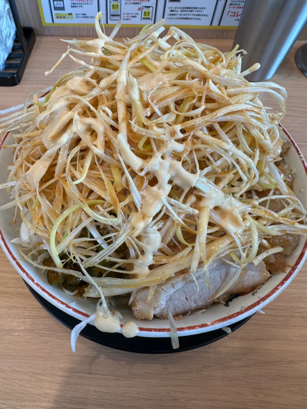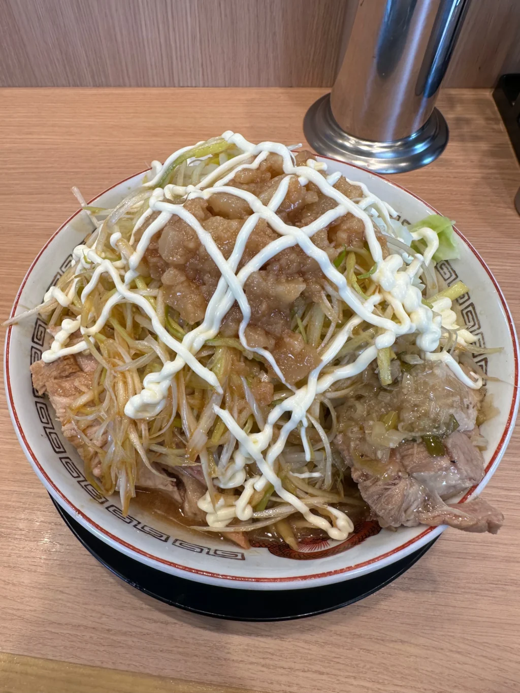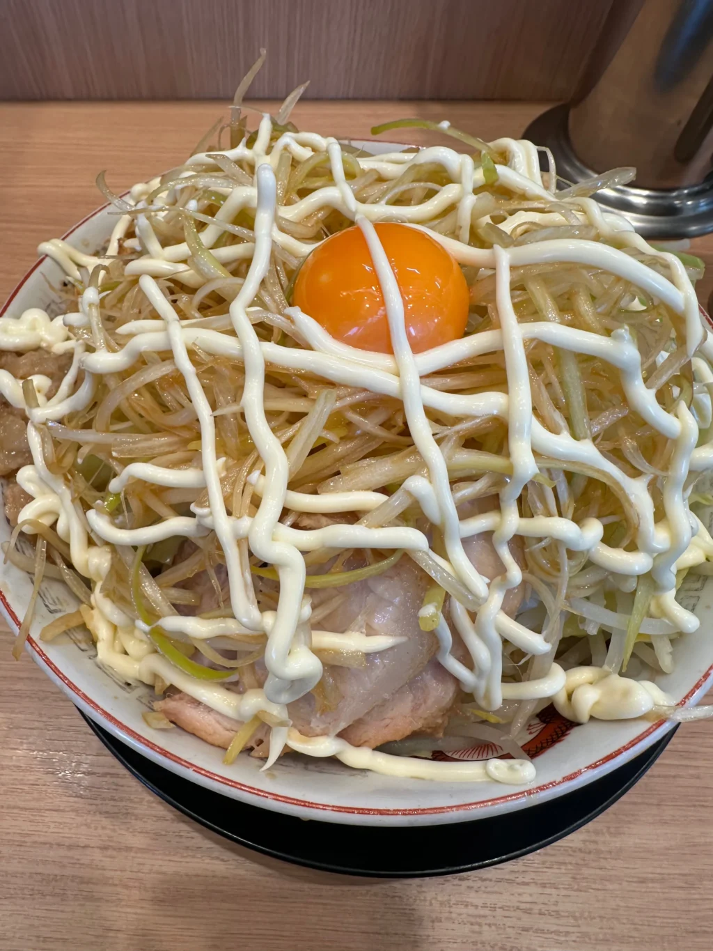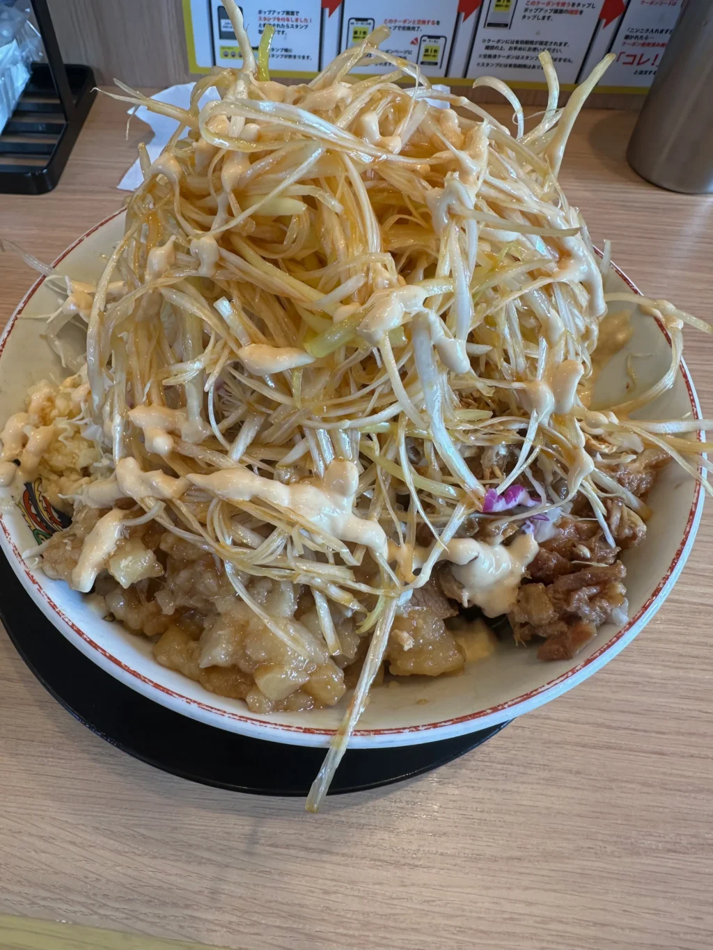 夏にだけ提供されるのが『冷やし中華』だ。ベースはたっぷりマヨネーズだれ、ゆでキャベツの代わりに千切りキャベツが載っていて、フライドオニオンのトッピング、仕上げにガリマヨ(ガーリックマヨネーズ)がかかっている。これがうめすぎるー!!夏場は、週3で通い、冷やし中華ばかり食べていた。『冷やし中華、ニンニク少し、他マシマシ』がわたくしの、鉄板メニューとなった。