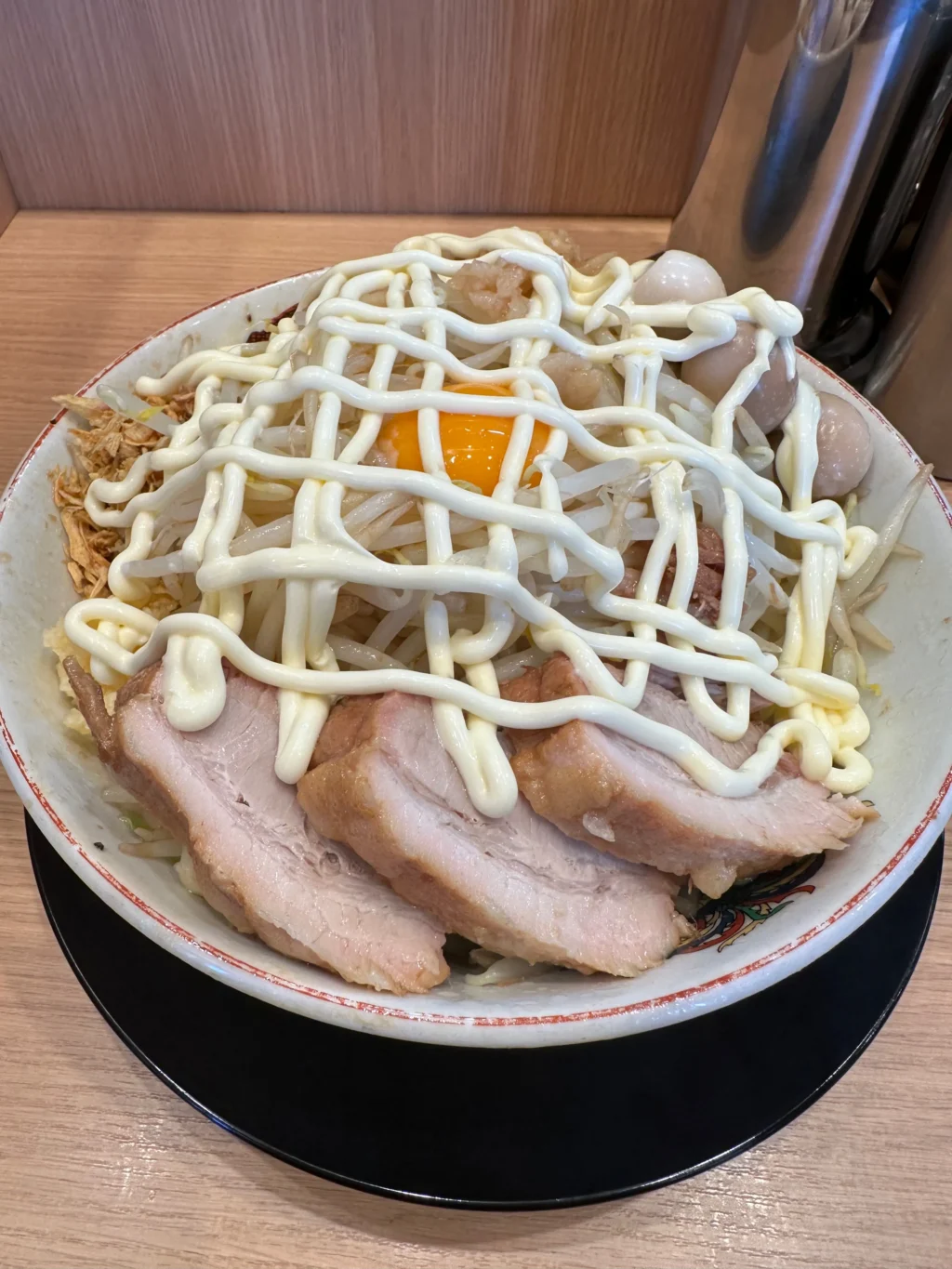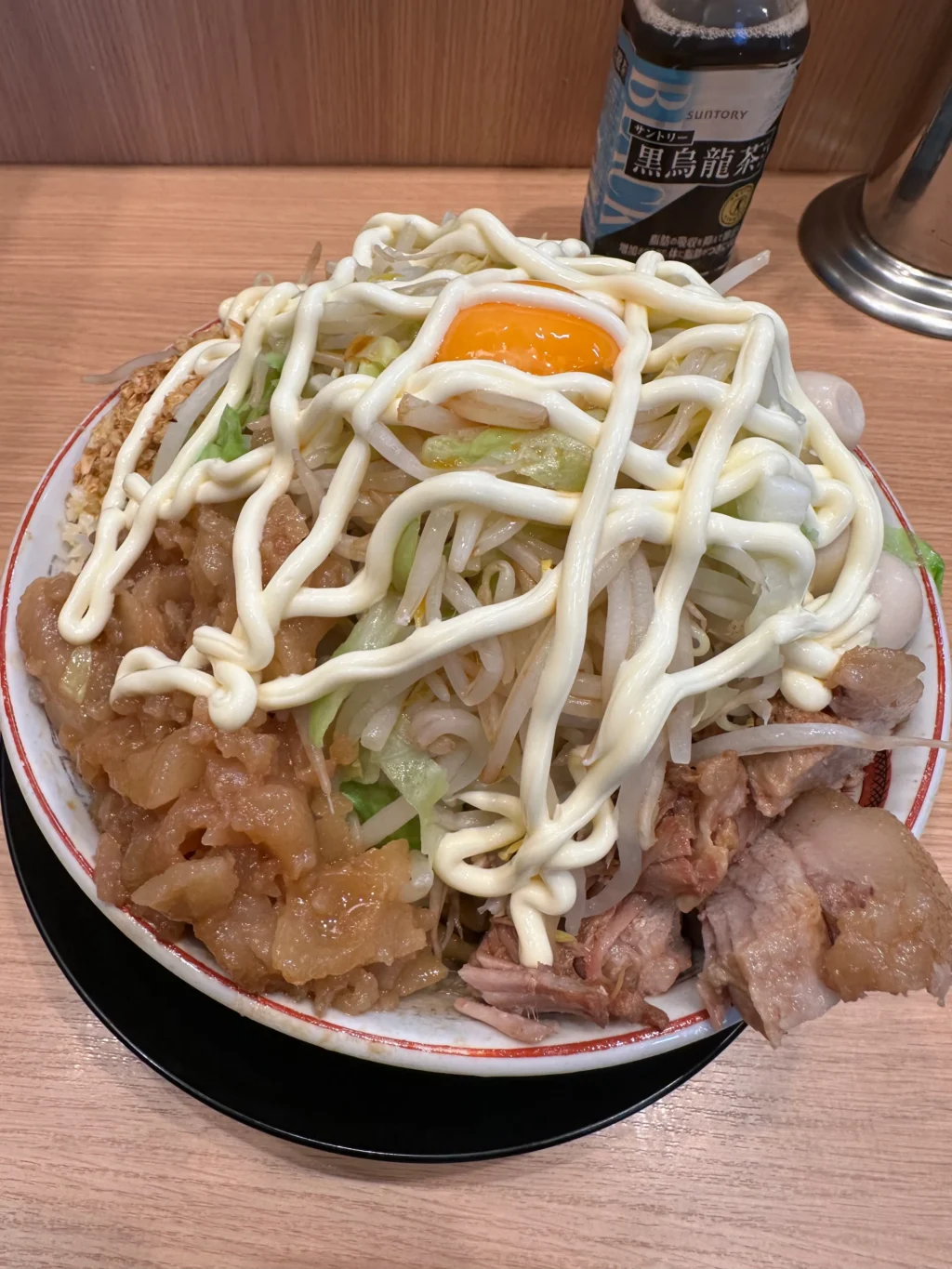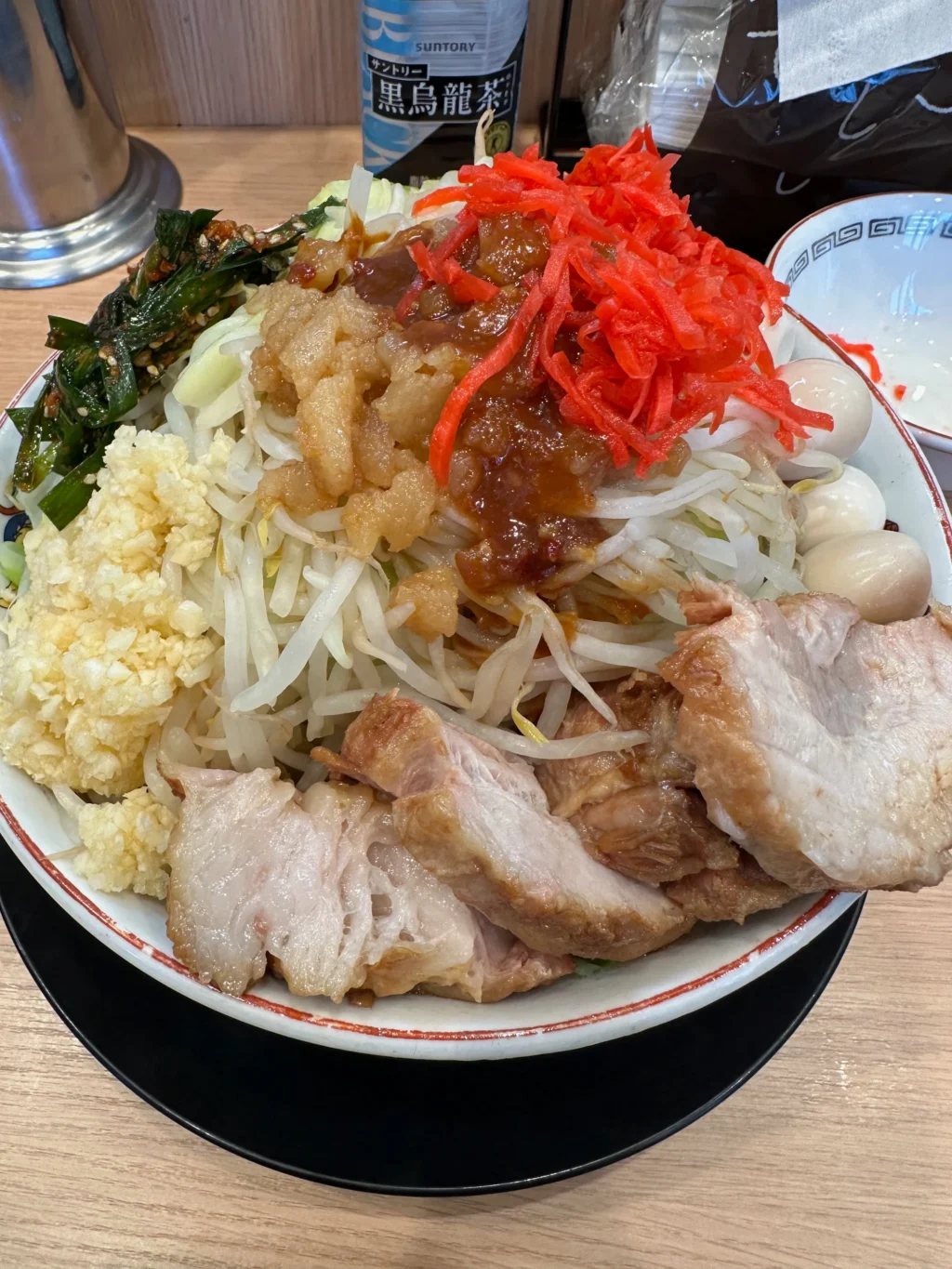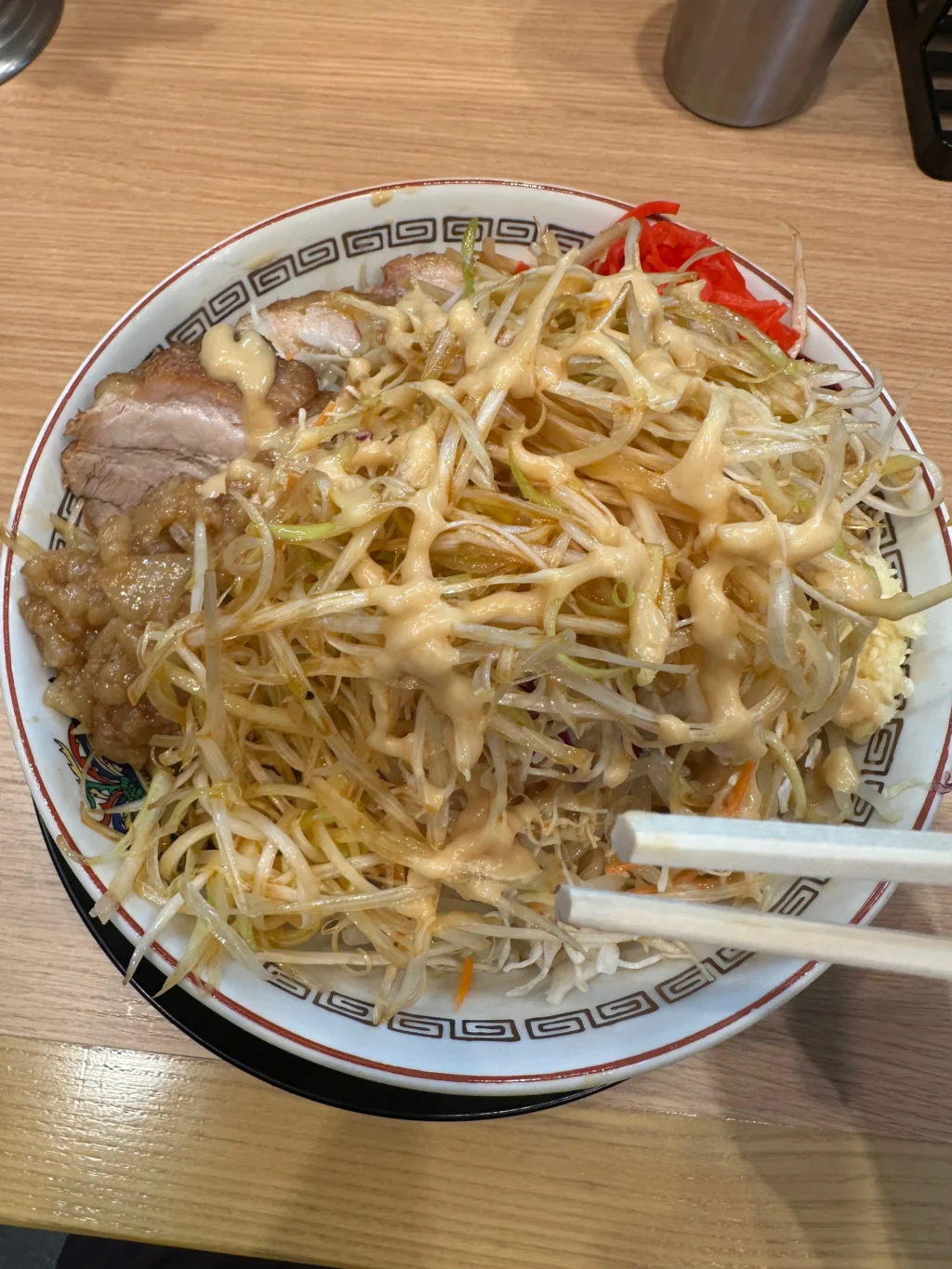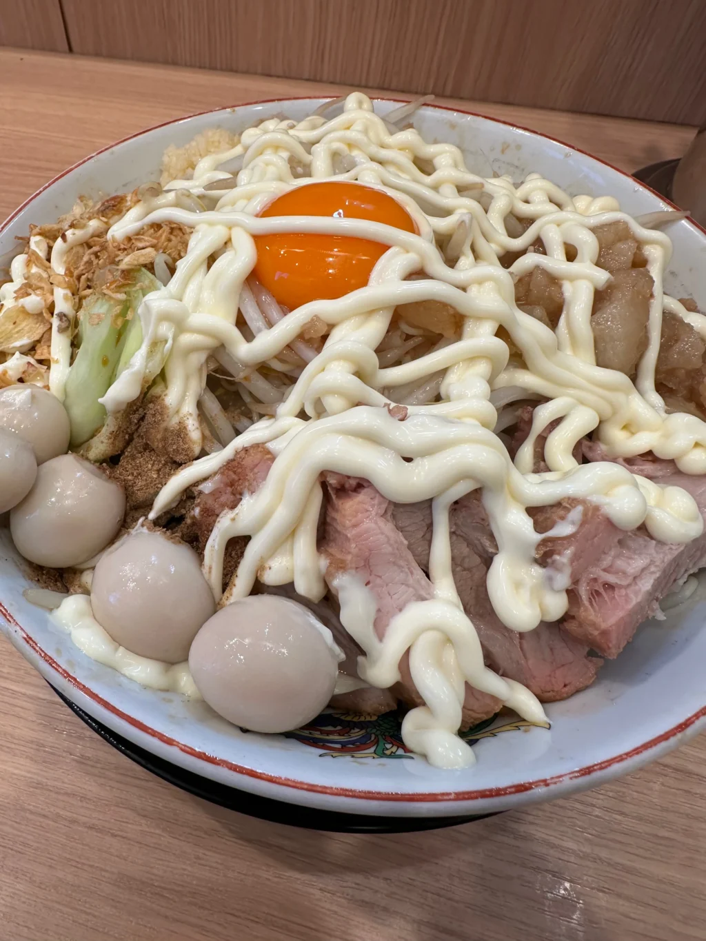 夏にだけ提供されるのが『冷やし中華』だ。ベースはたっぷりマヨネーズだれ、ゆでキャベツの代わりに千切りキャベツが載っていて、フライドオニオンのトッピング、仕上げにガリマヨ(ガーリックマヨネーズ)がかかっている。これがうめすぎるー!!夏場は、週3で通い、冷やし中華ばかり食べていた。『冷やし中華、ニンニク少し、他マシマシ』がわたくしの、鉄板メニューとなった。