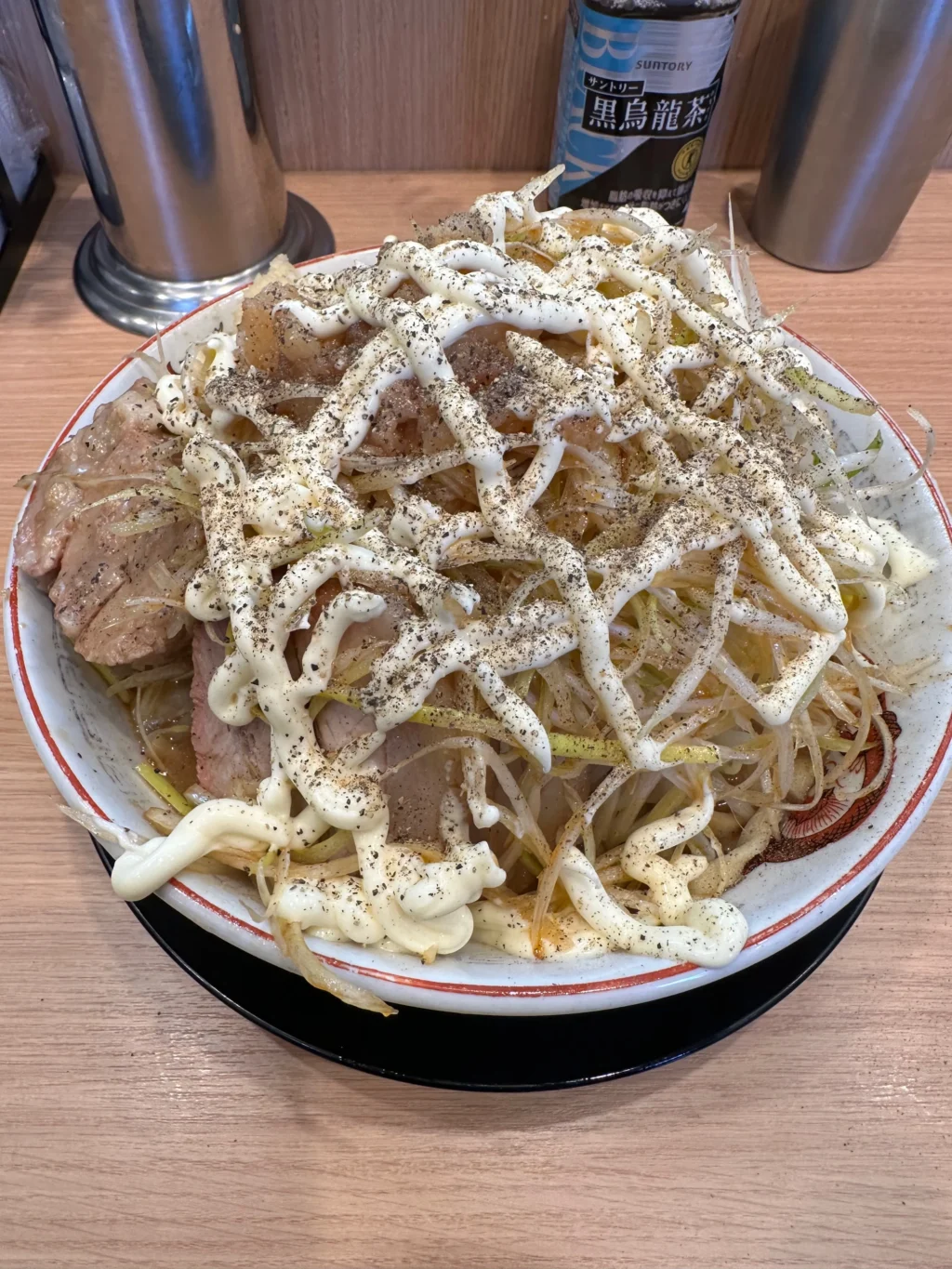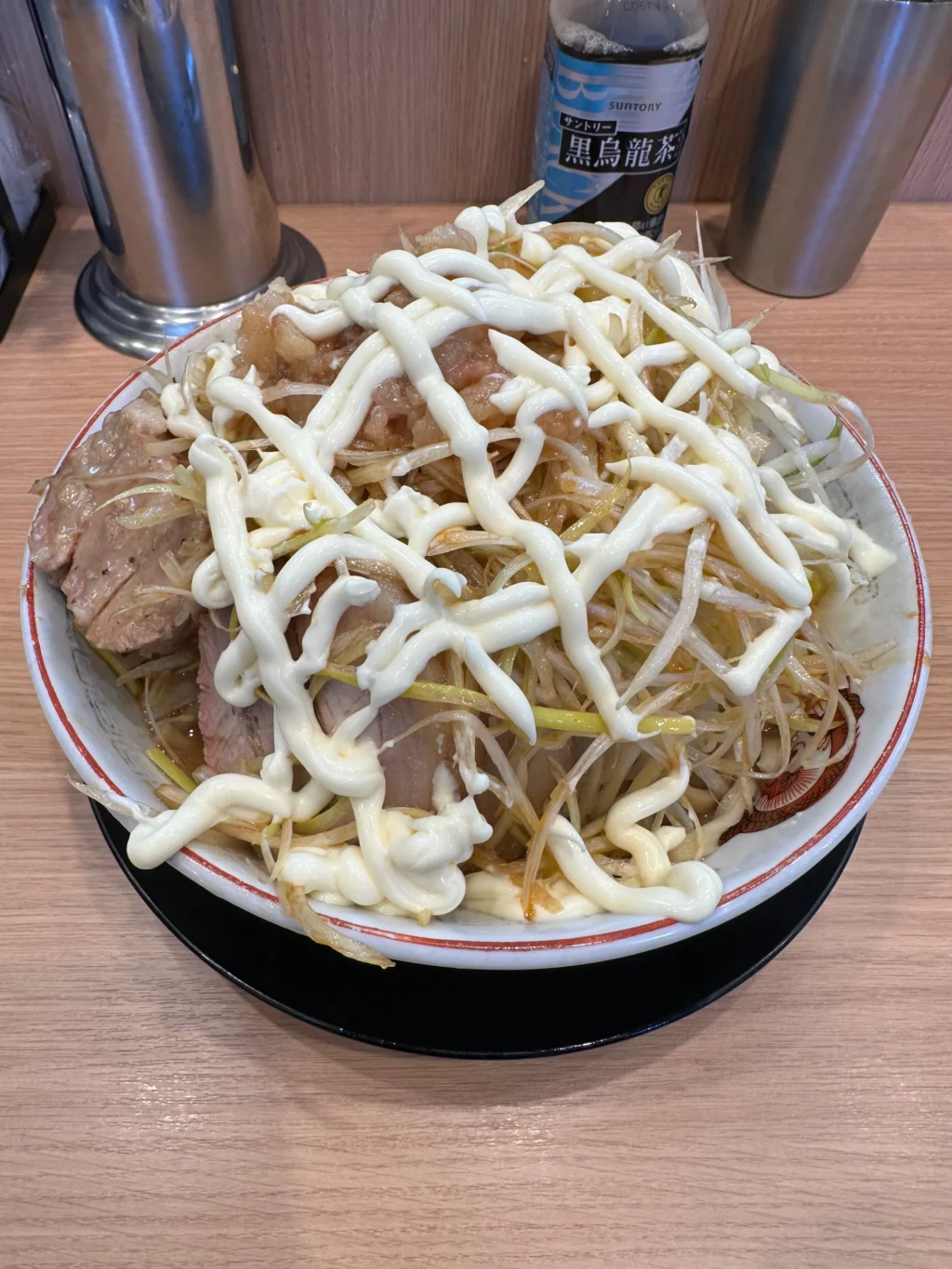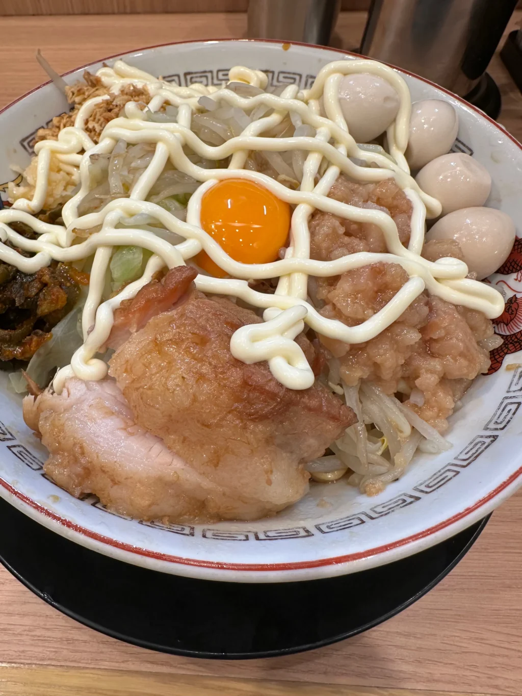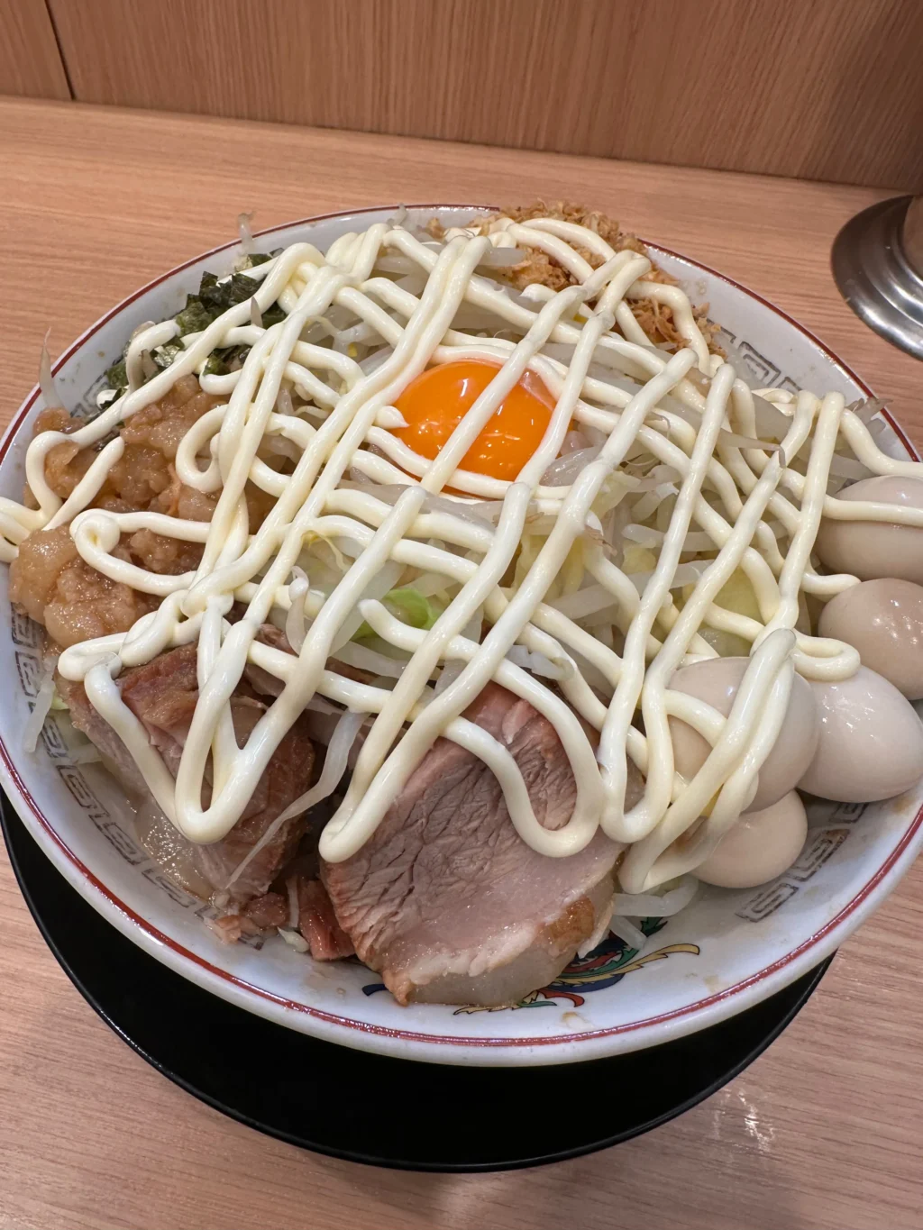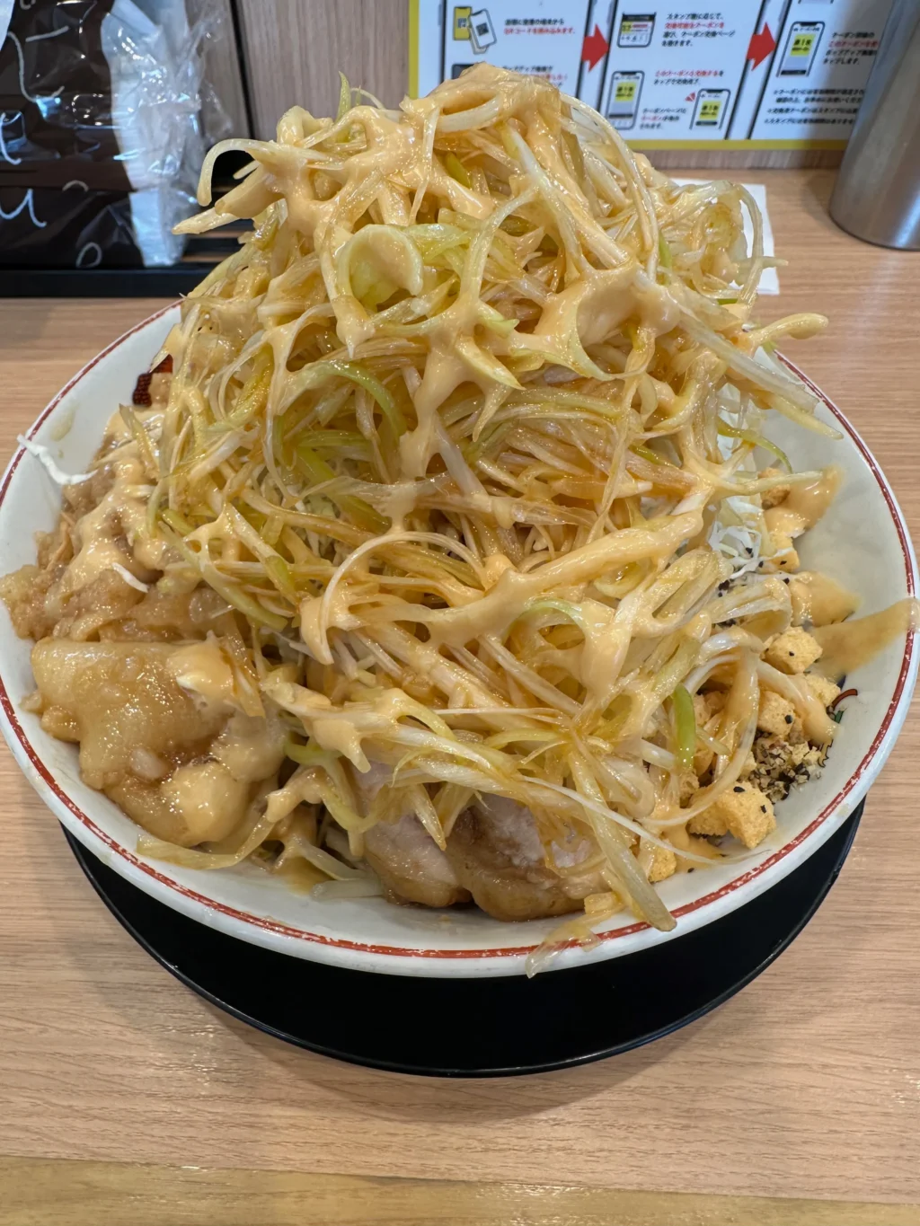 夏にだけ提供されるのが『冷やし中華』だ。ベースはたっぷりマヨネーズだれ、ゆでキャベツの代わりに千切りキャベツが載っていて、フライドオニオンのトッピング、仕上げにガリマヨ(ガーリックマヨネーズ)がかかっている。これがうめすぎるー!!夏場は、週3で通い、冷やし中華ばかり食べていた。『冷やし中華、ニンニク少し、他マシマシ』がわたくしの、鉄板メニューとなった。