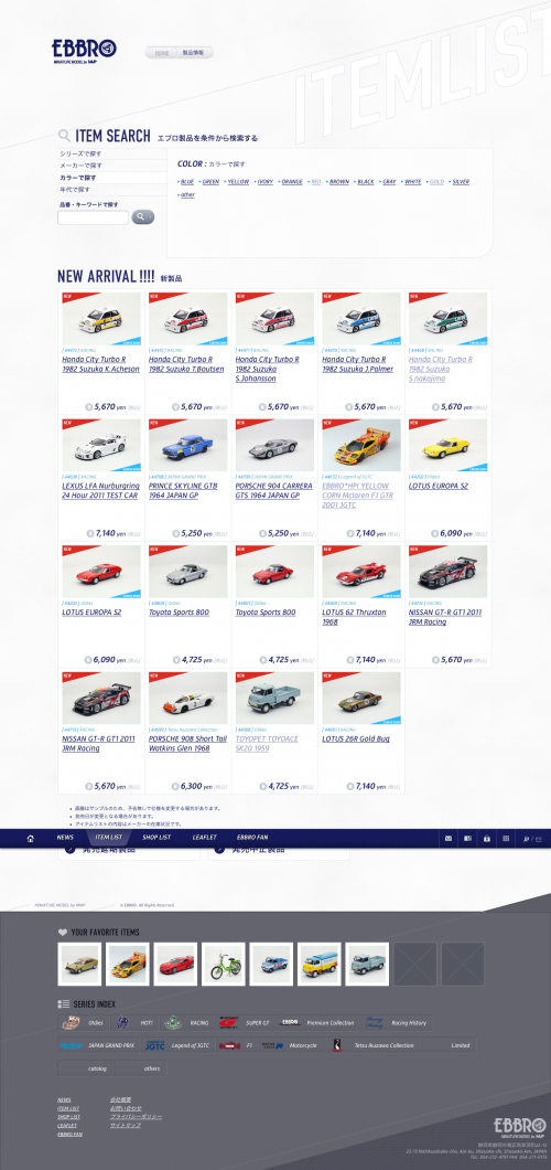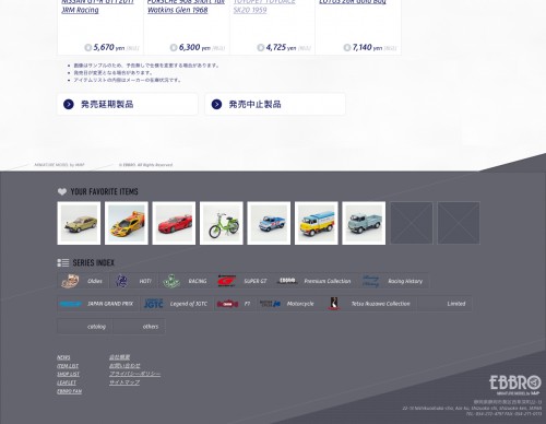 静岡市のミニチュアカー製造メーカーEBBROのコーポレートサイトを制作しました。メーカーとしてのブランディングはもちろん、1000種類を越える製品を視覚的かつスムーズに検索・閲覧できるギャラリーとしての機能の実現を主な目的とし、加えて、海外展開に力を注ぐにあたりグローバルサイトも並行して制作しました。