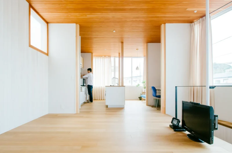 木目が天井から壁へスムーズに繋がっているのがプロのこだわり。