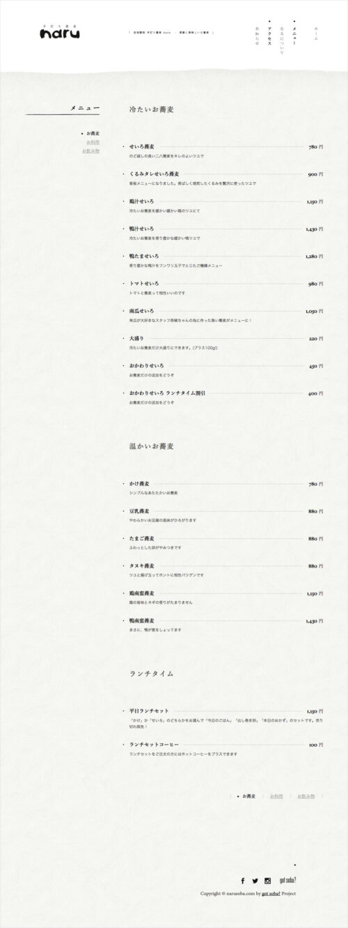 デザインに関しては、お蕎麦の写真はトップページの一枚だけ。でもそれは、店主ゴリさんのとっても想い入れのある写真です。わたくしも、デザインの小細工を控えて、この一枚の見え方にひたすらこだわらせていただきました。