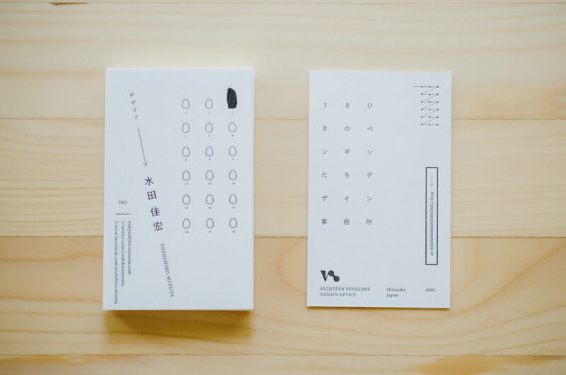 『18ひきのペンギンたちデザイン事務所』が18文字だったり、ペンギンたちのたまごを18コ(内1コは孵化してる)並べたりして、やりたい放題やってやった。載っているのは氏名とウェブのURL、メールアドレスにFacebookとInstagramのアドレスだけである。