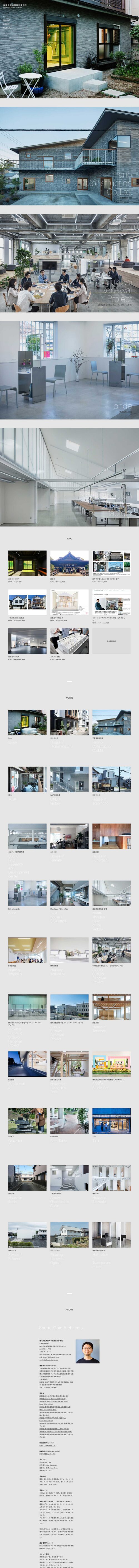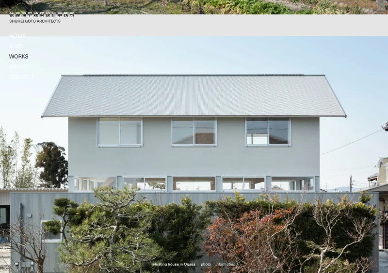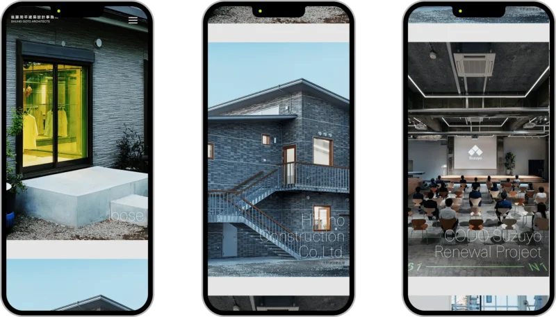 今回のウェブサイトは、その周平さんのポリシーと、それを踏襲した建築事務所のカラーを体現したようなものになった。無駄な装飾 / コンテンツは削ぎ落とし、見る側の行動フローも極力タップなどのアクションを少なくする構成。色彩もほぼ白・黒と、ベースのグレーに絞り、相対的に作品写真が目を惹く設計になっている。